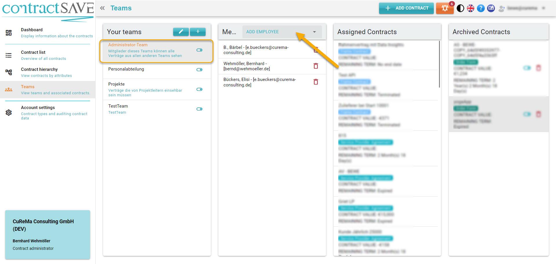 Contract administrators are responsible for managing teams. They create and edit teams, add or remove members who no longer need access to the contracts. They can reactivate archived contracts or permanently delete them. Additionally, they can assign a contract to any team.