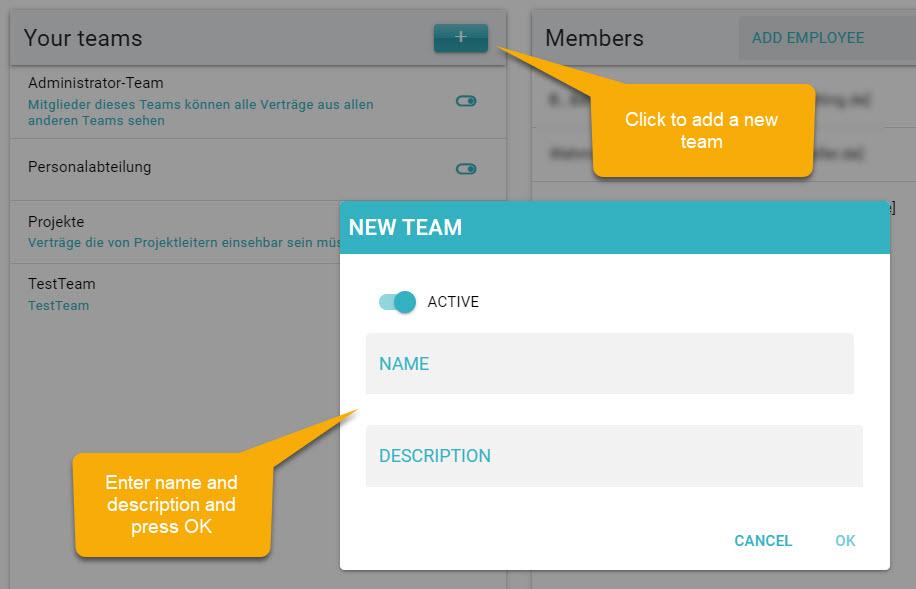 In the lower section of the pop-up window, the teams visible to the current user are displayed. Now you can select the teams that should receive access to the contract.
