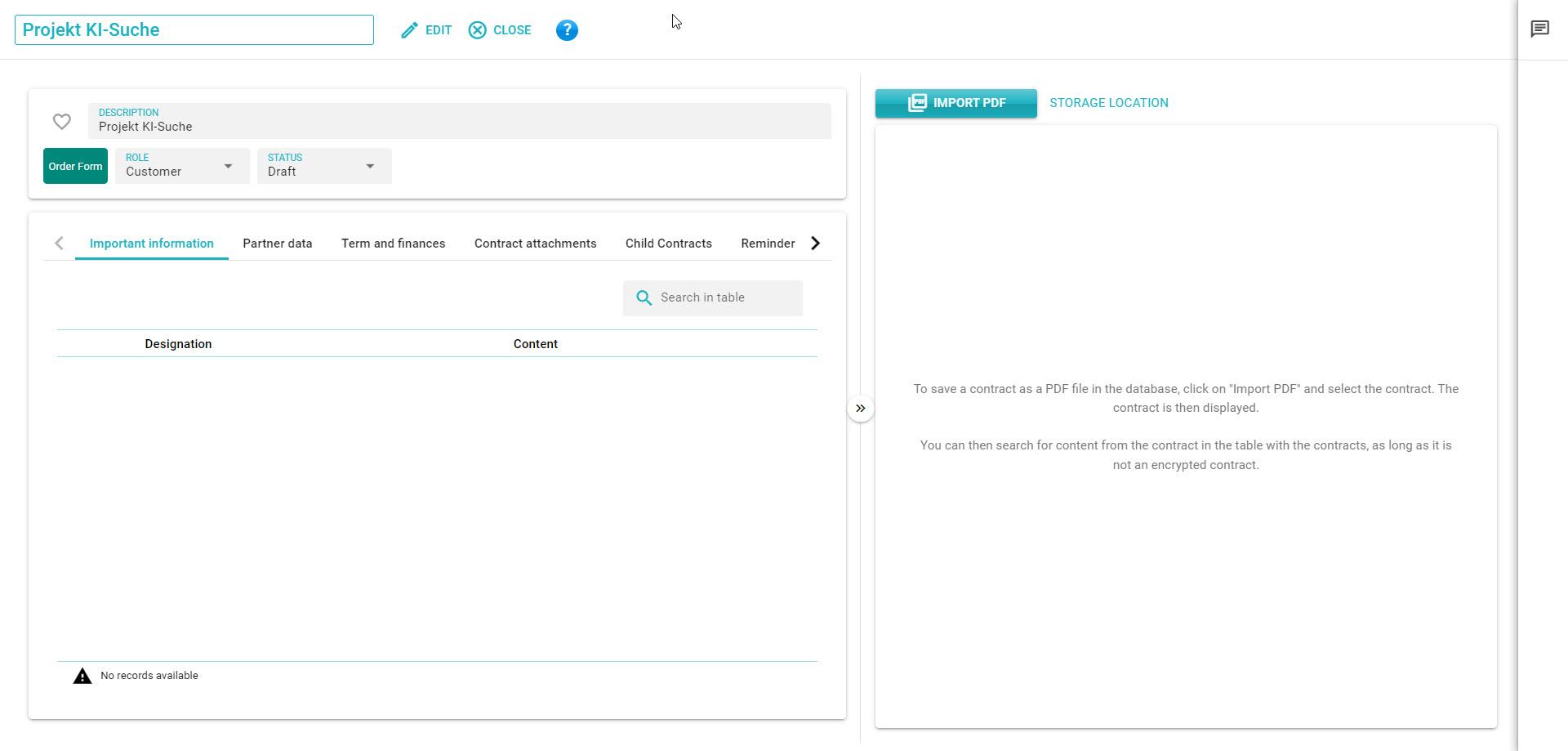 Click on "Import PDF" to import the contract document. This will store an encrypted version of the contract in the database.