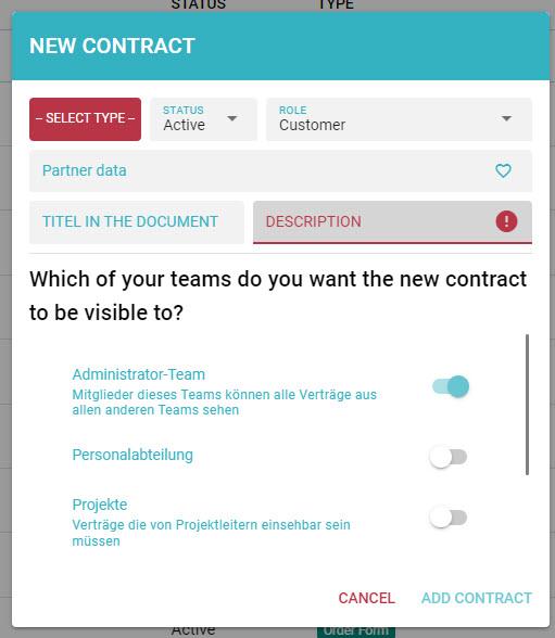 Finally, select the contract team or teams in which the contract should be visible. Employees belonging to at least one of the selected teams can view the contract.